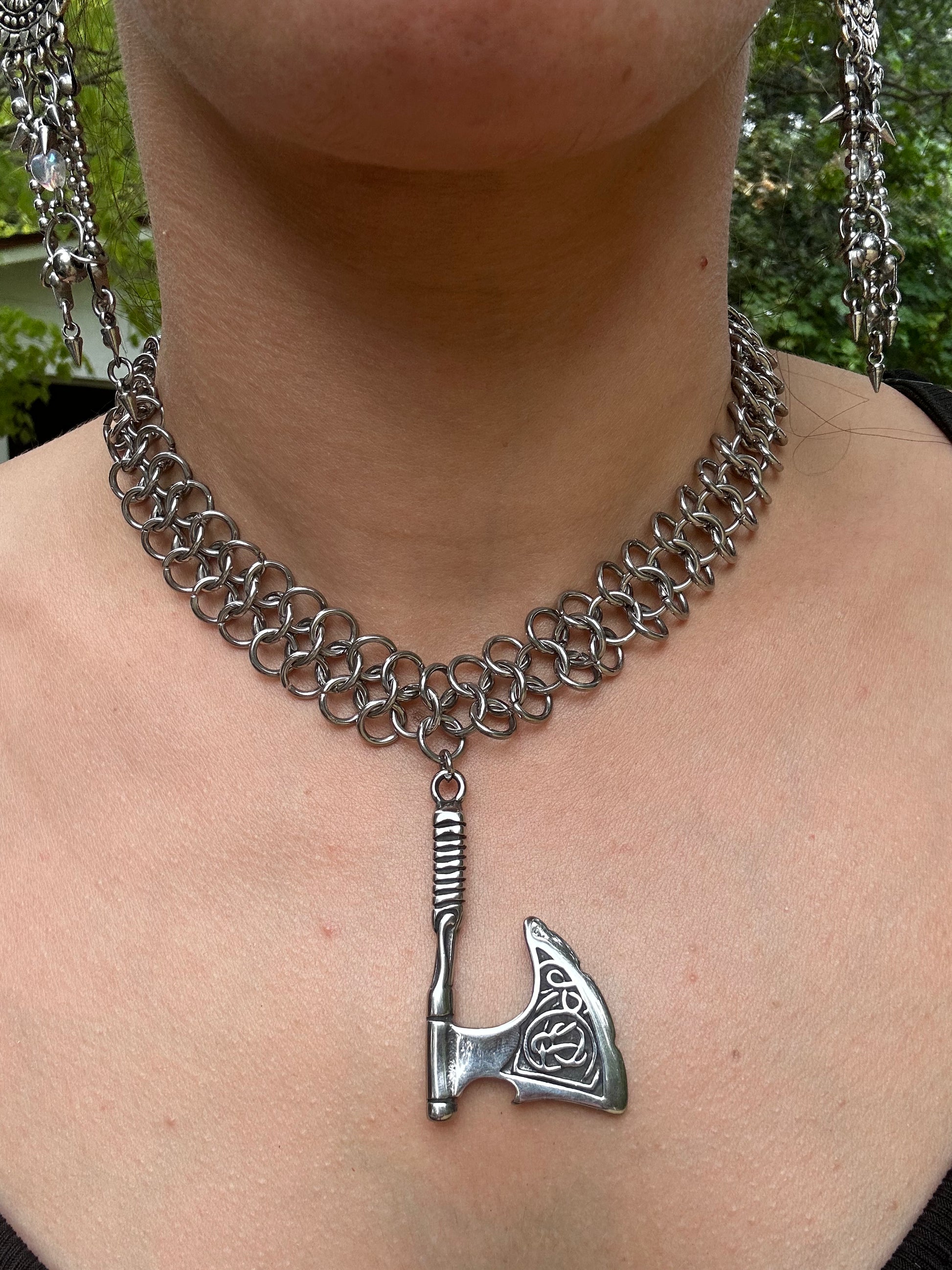 Handmade chainmaile with ax pendant. Made with all stainless steel. 15 inches in length