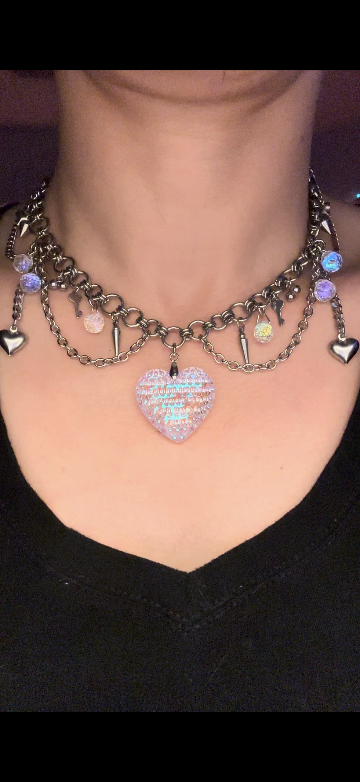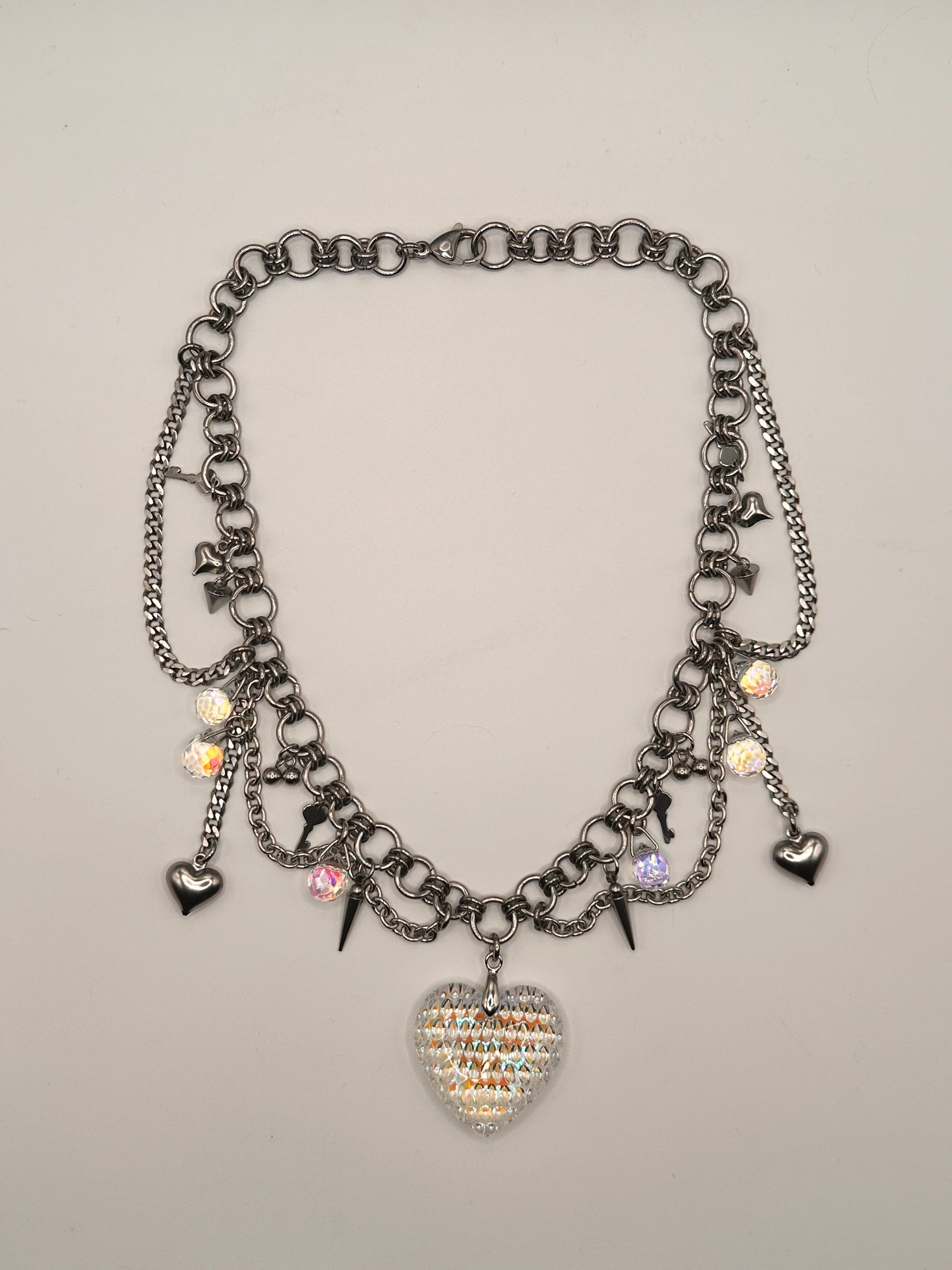 Handmade chain using stainless steel, glass AB Beads, steel charms and a textured glass heart.