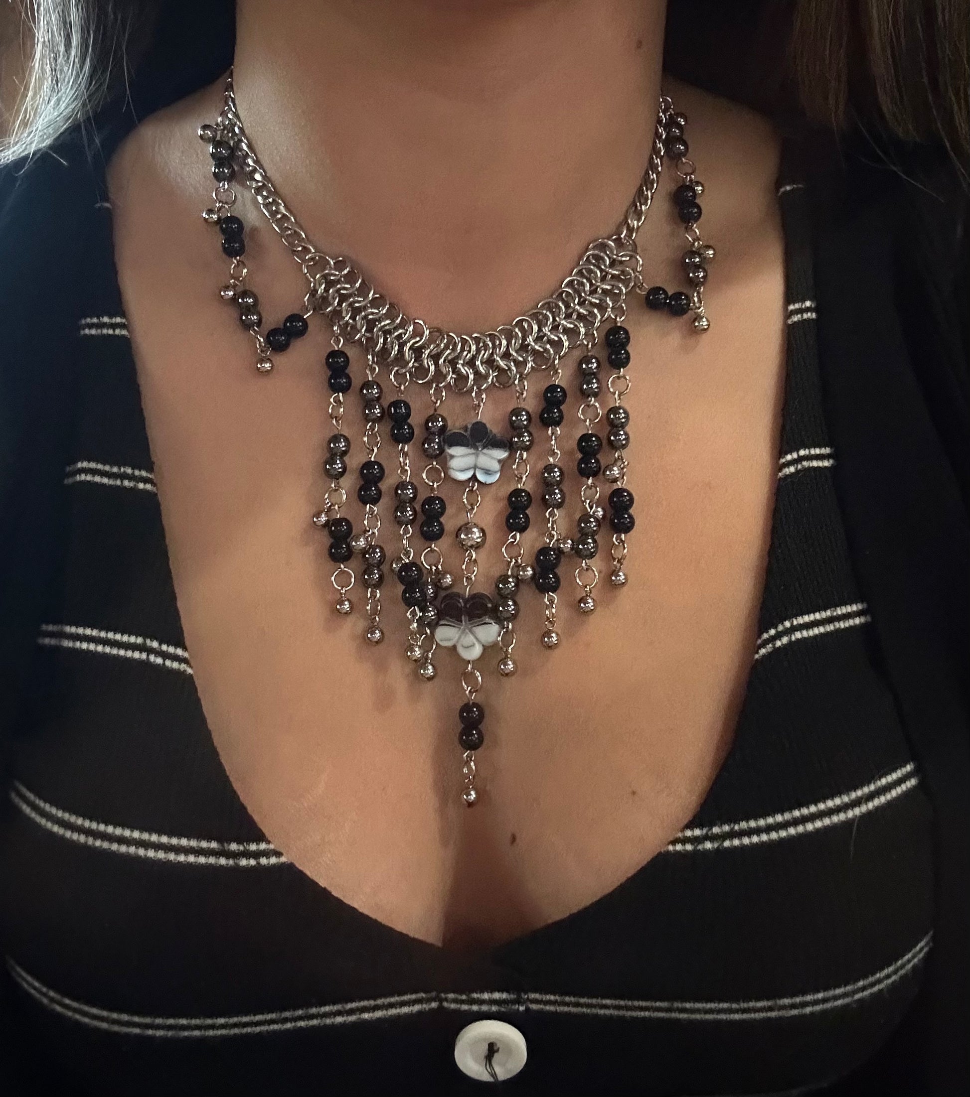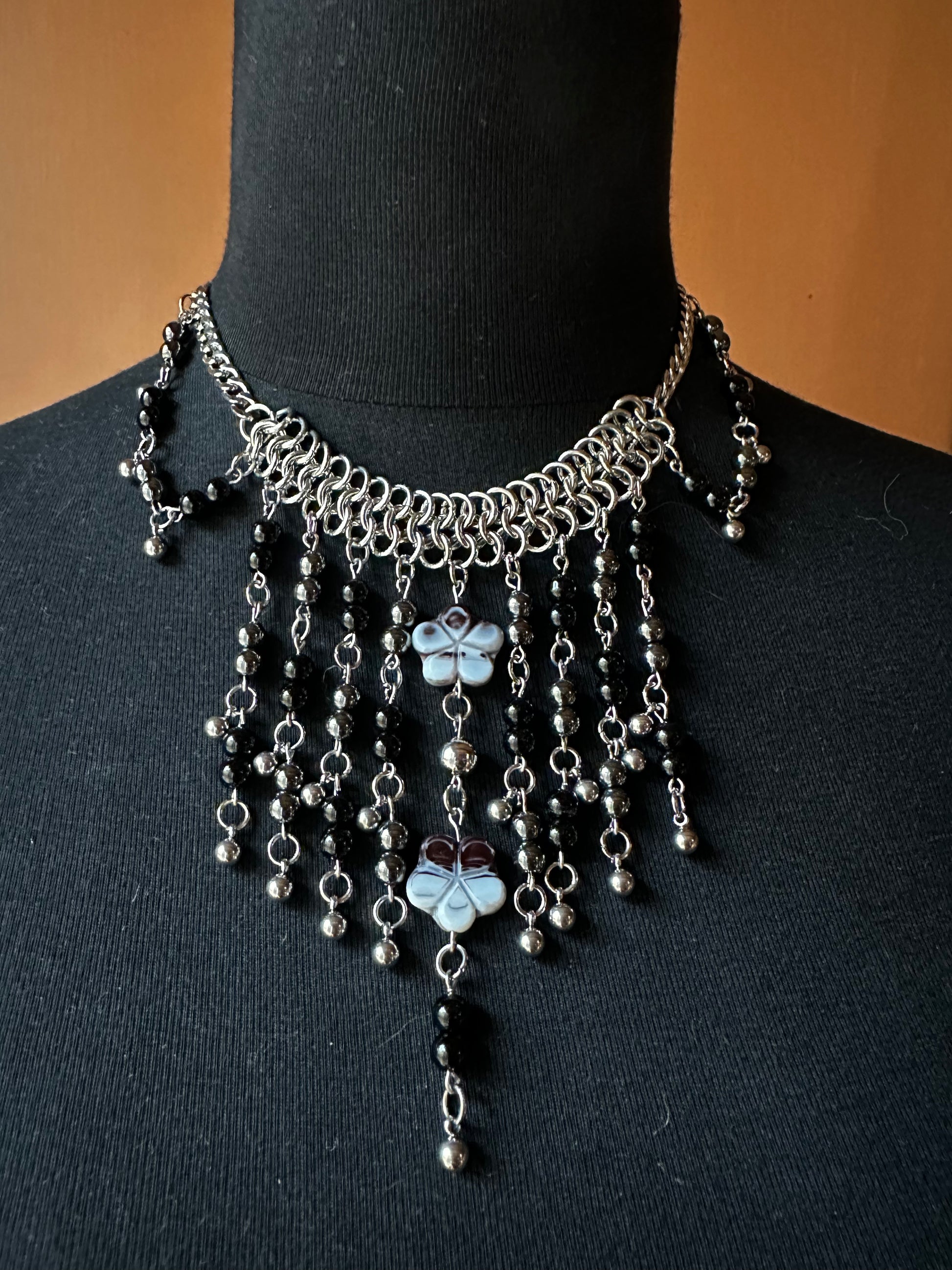 handmade chainmaile with plated hematite beads, stainless steel, agate beads and Czech glass flower beads