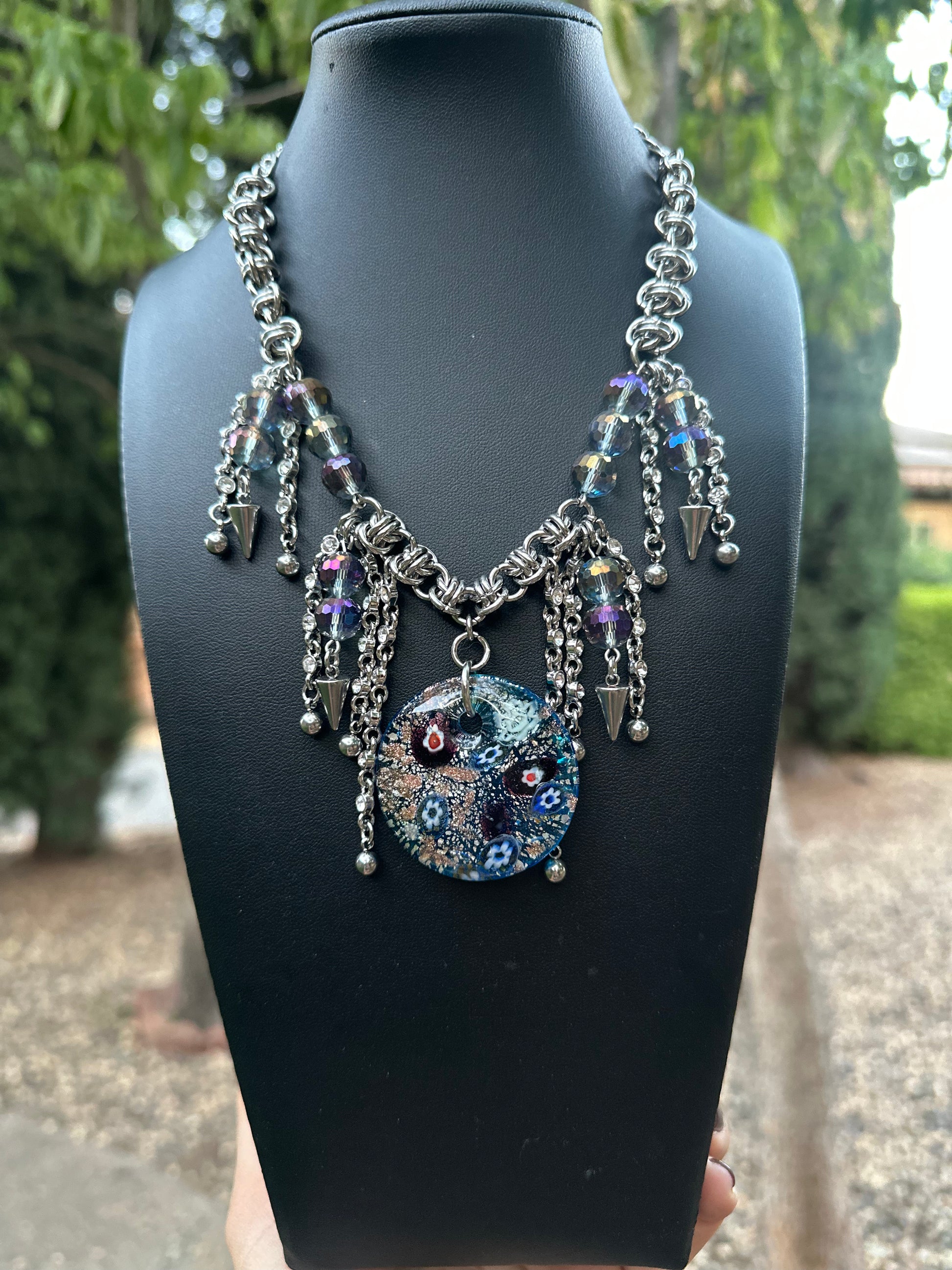 Steel Barrel weave chainmaile, steel chain, upcycled rhinestone chain and glass pendant.