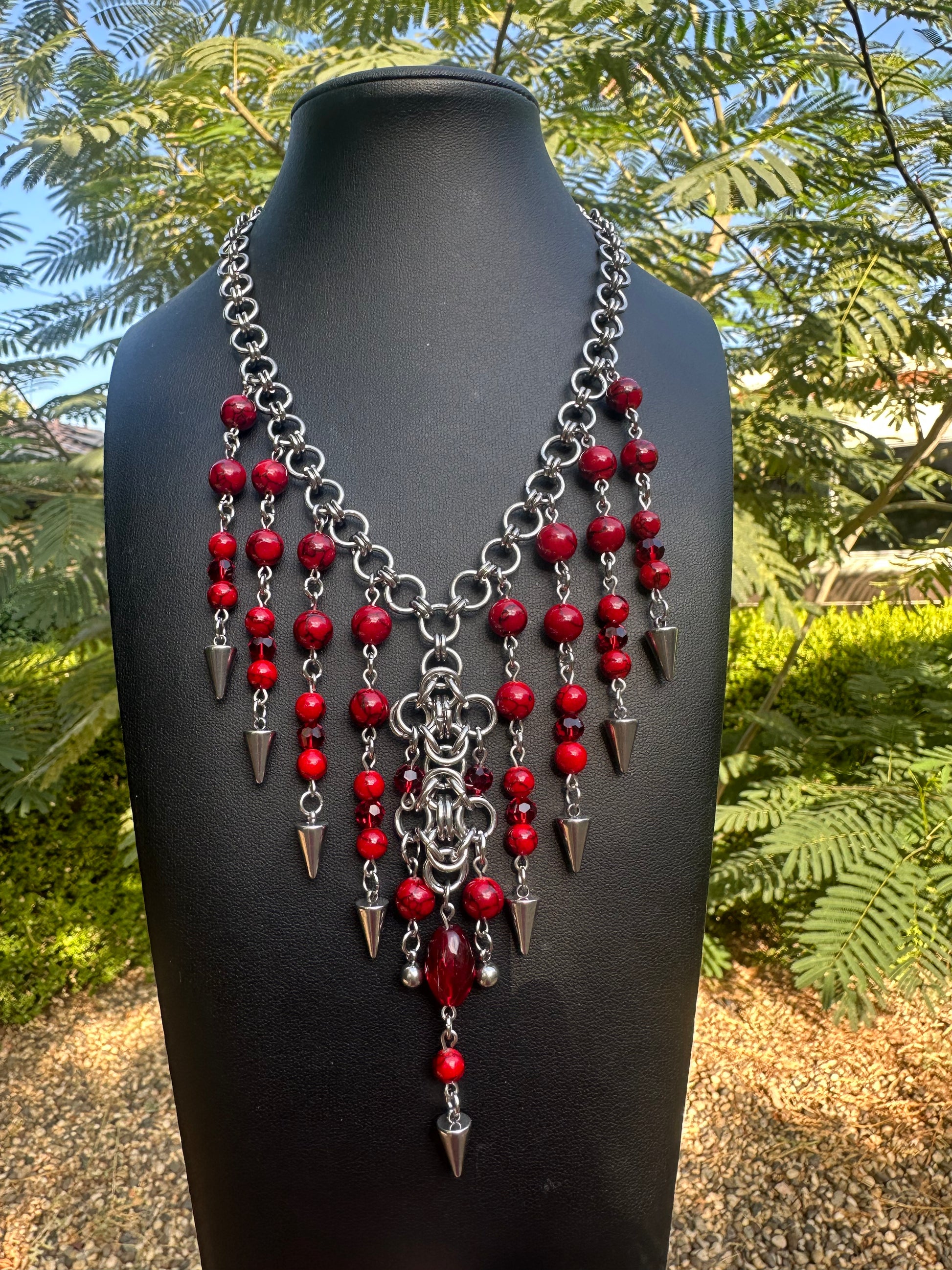 Made using dyed agate beads, glass beads and stainless steel handmade chain and chainmaile pendant.