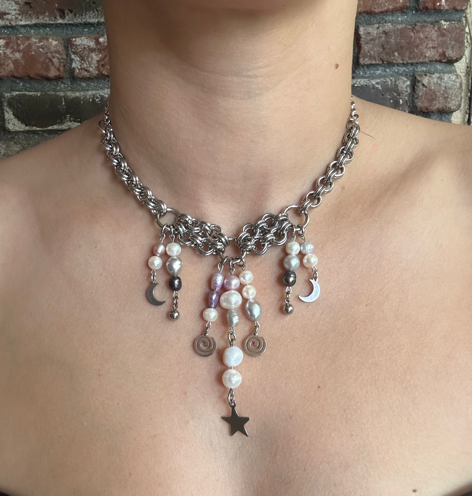 Handmade stainless steel chain with freshwater pearls and all stainless steel charms.