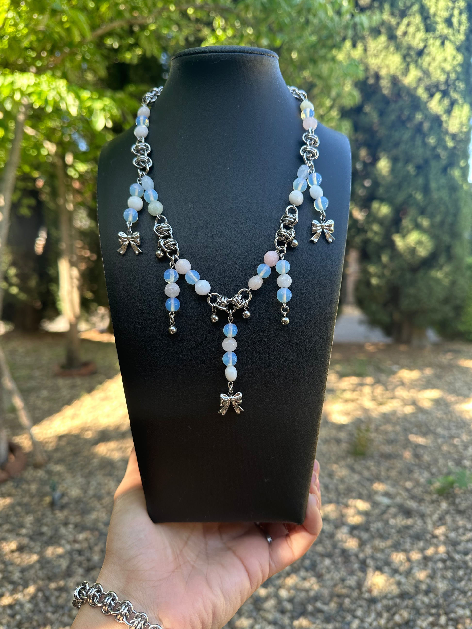 Made using dyed agate beads, glass and stainless steel. Necklace length is 16 1/2 inches, extender can be added upon request!